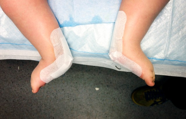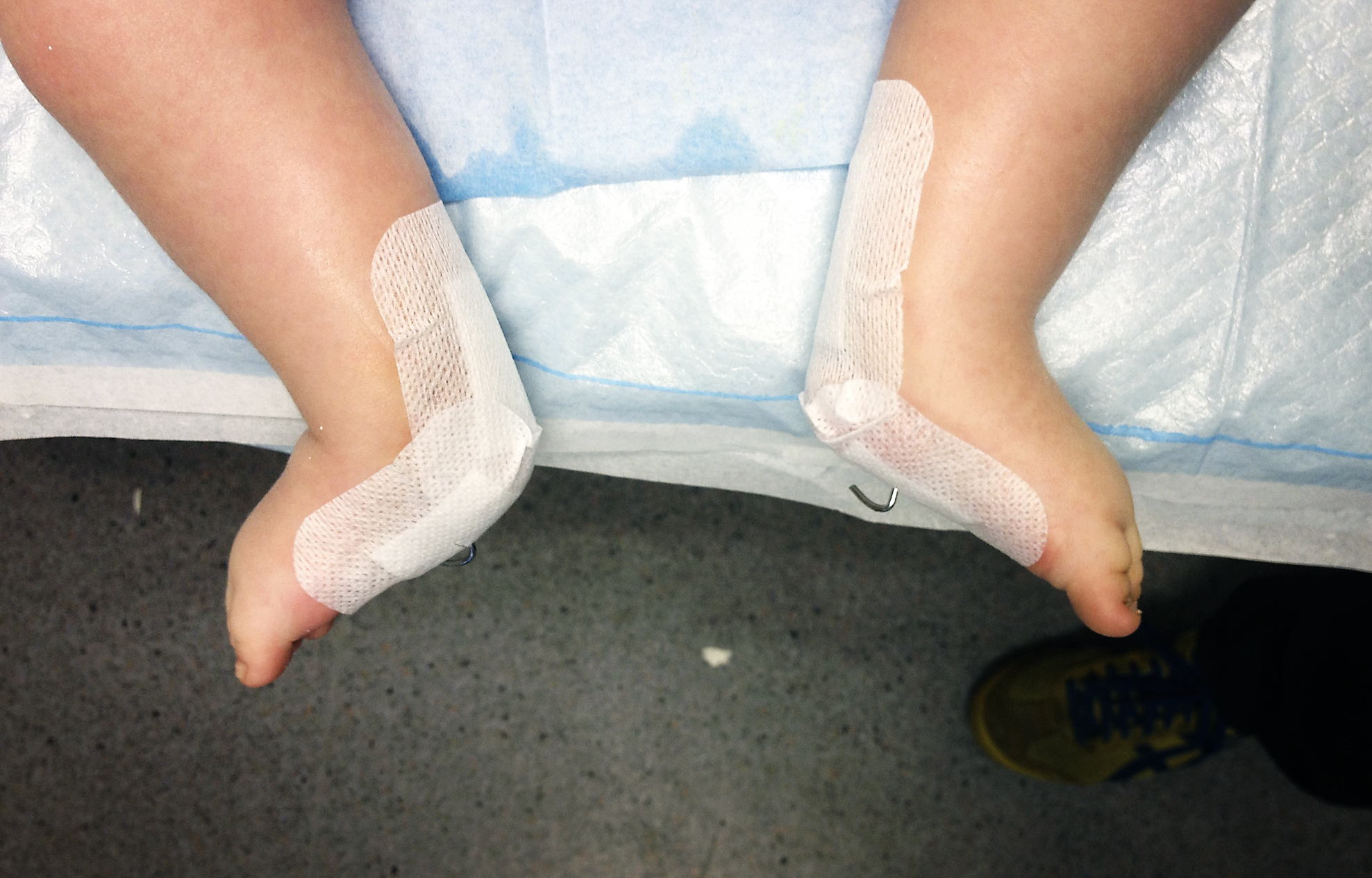 Ok… In de eerste maanden had dr. P. wel eens laten vallen dat hij ze niet zou moeten opereren…maar arthrogryposevoeten kan je niet bevriezen…dus later bleek dat de voetjes toch naar spitsstand evolueerden, ondanks de gipsjes.